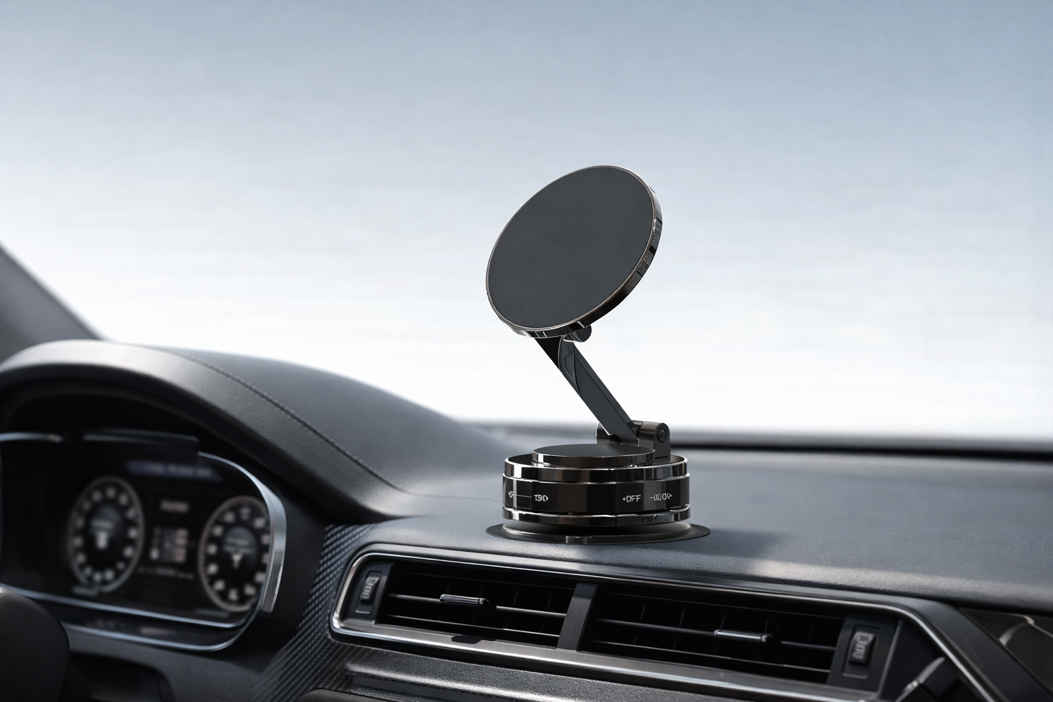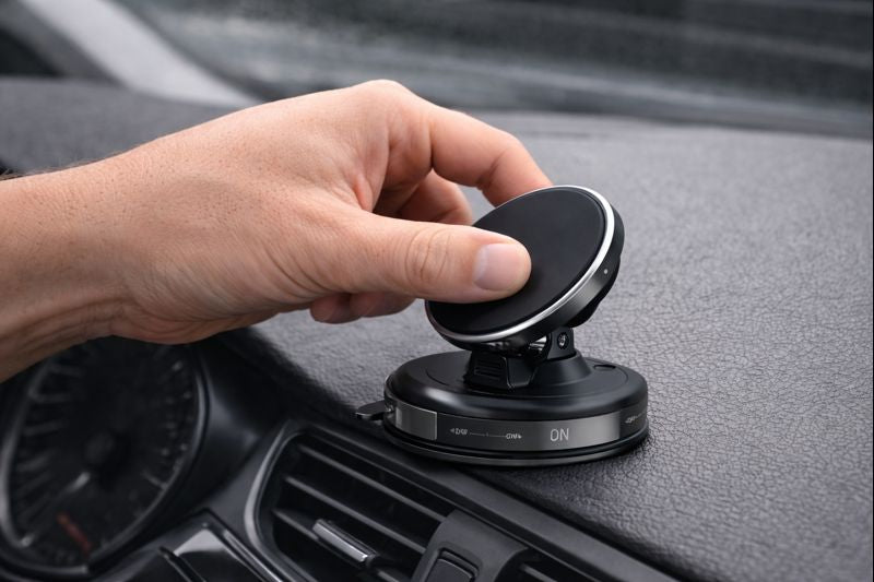 Setze den Halter auf und aktiviere den Vakuum-Mechanismus. Der Halter sitzt fest und bleibt auch bei Bewegung stabil.